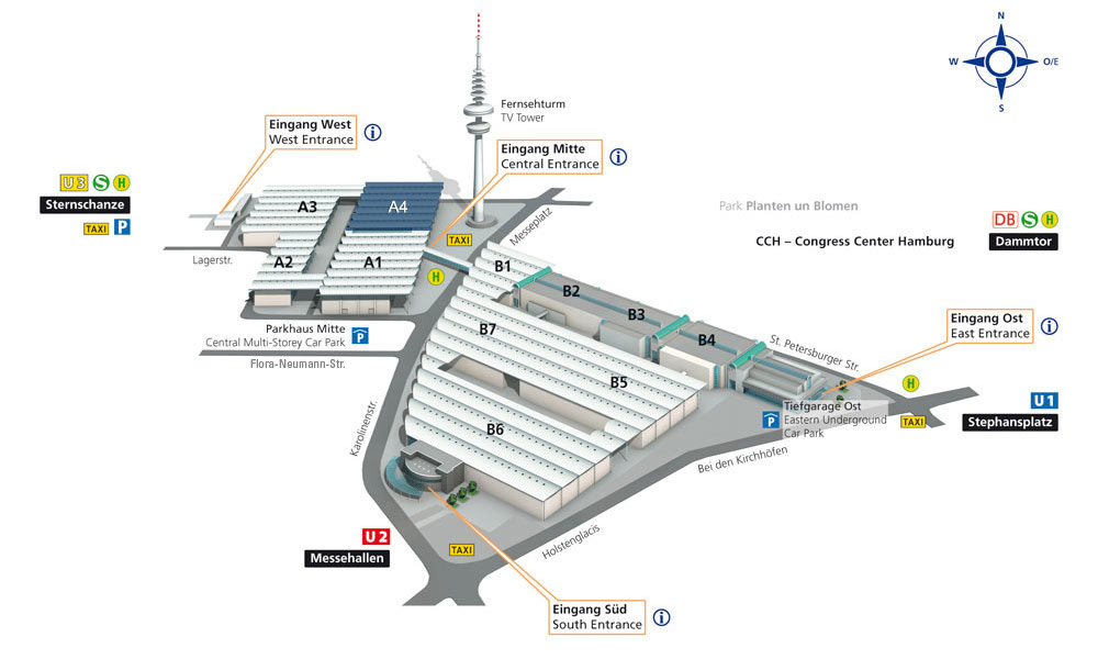 Even when there are large exhibits on show, this hall gives a spacious impression with its ceiling height of 17.3 m. Access is via the Central Foyer. There is a big conference area for up to 1,280 participants directly above the 8,000 m² exhibition hall.